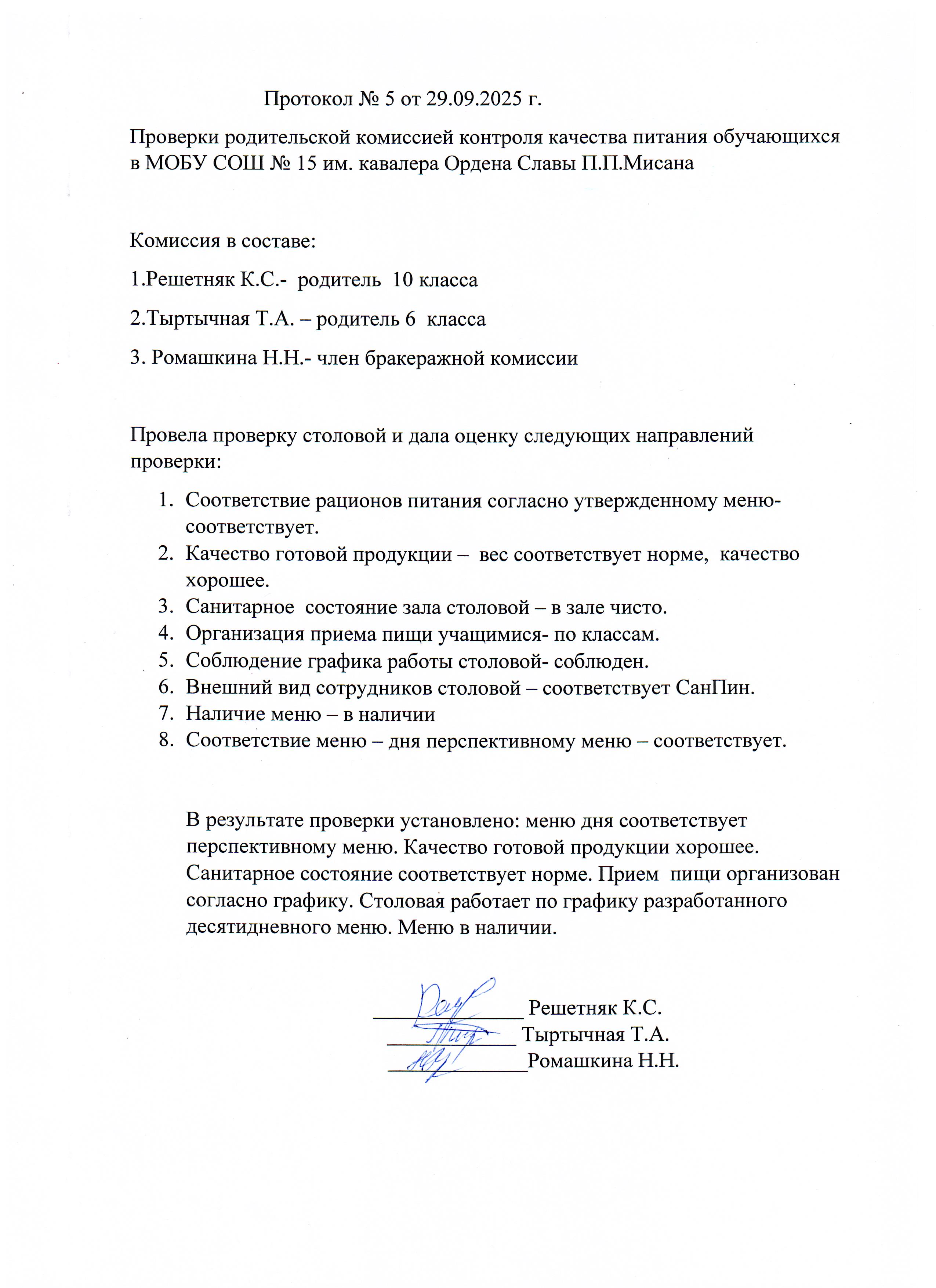 Протокол родительского контроля организации горячего питания в школьной столовой 29.09.2025-03.10.2025