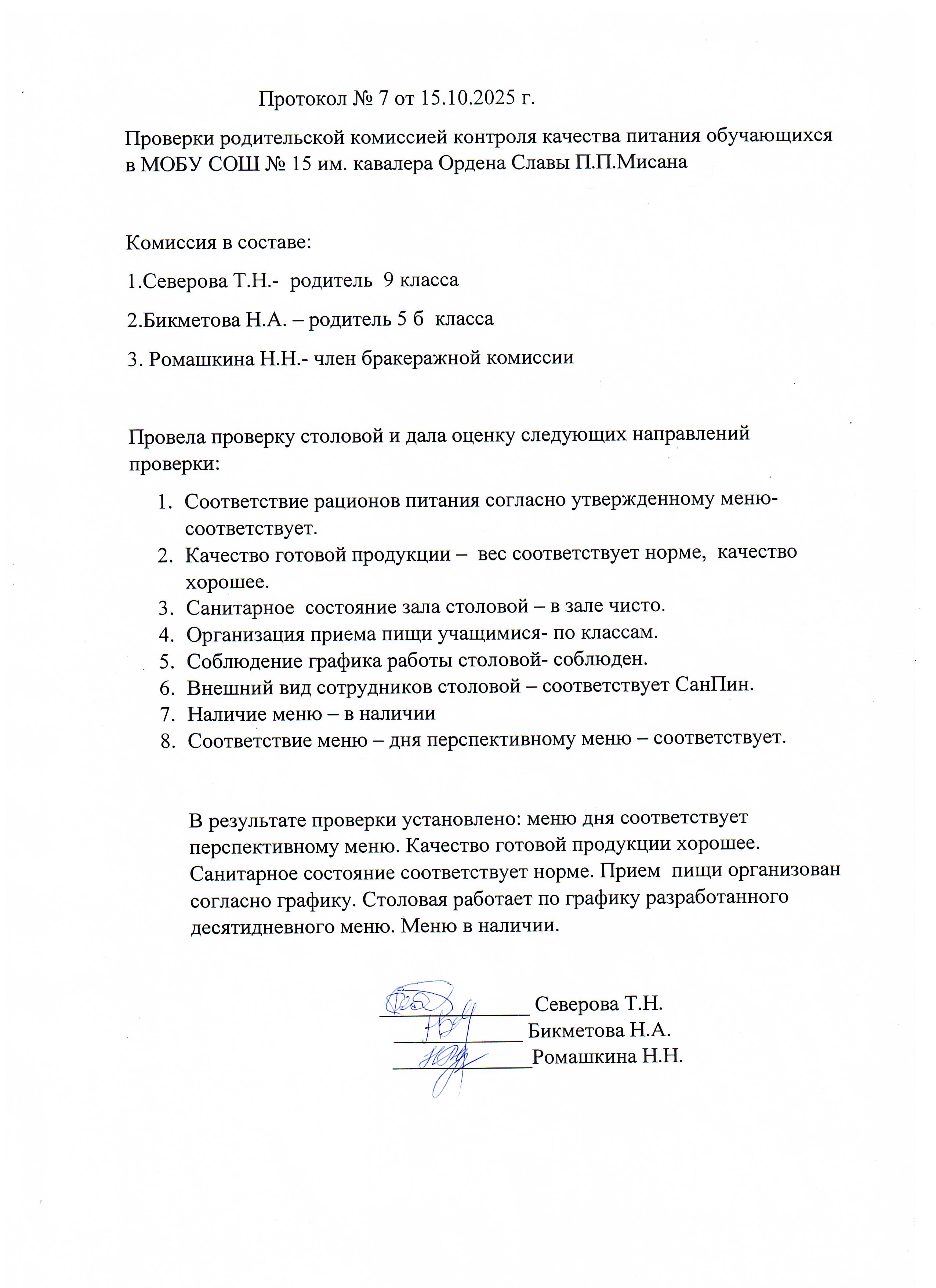 Протокол родительского контроля организации горячего питания в школьной столовой 06.10.2025-10.10.2025