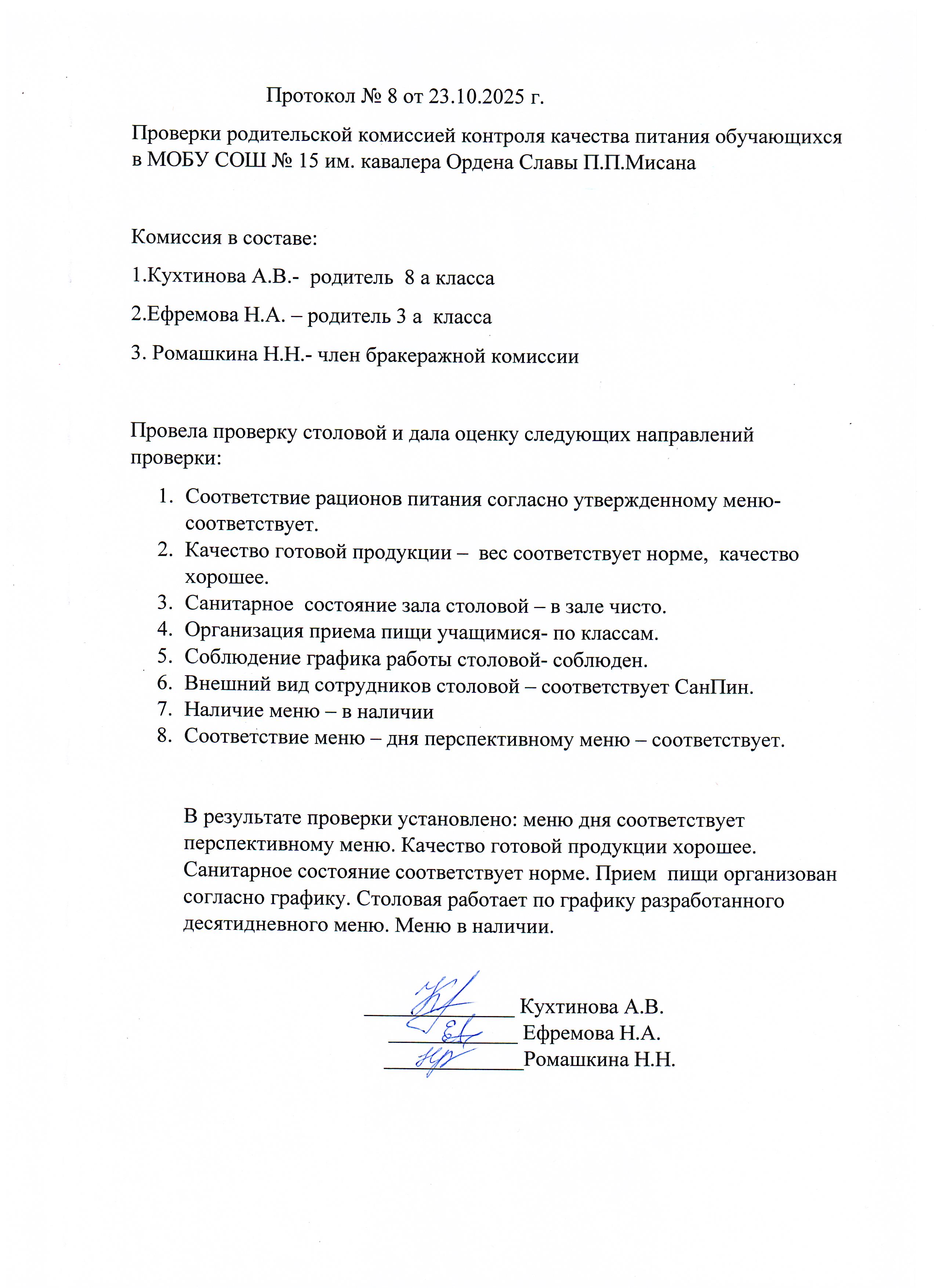 Протокол родительского контроля организации горячего питания в школьной столовой 20.10.2025-24.10.2025
