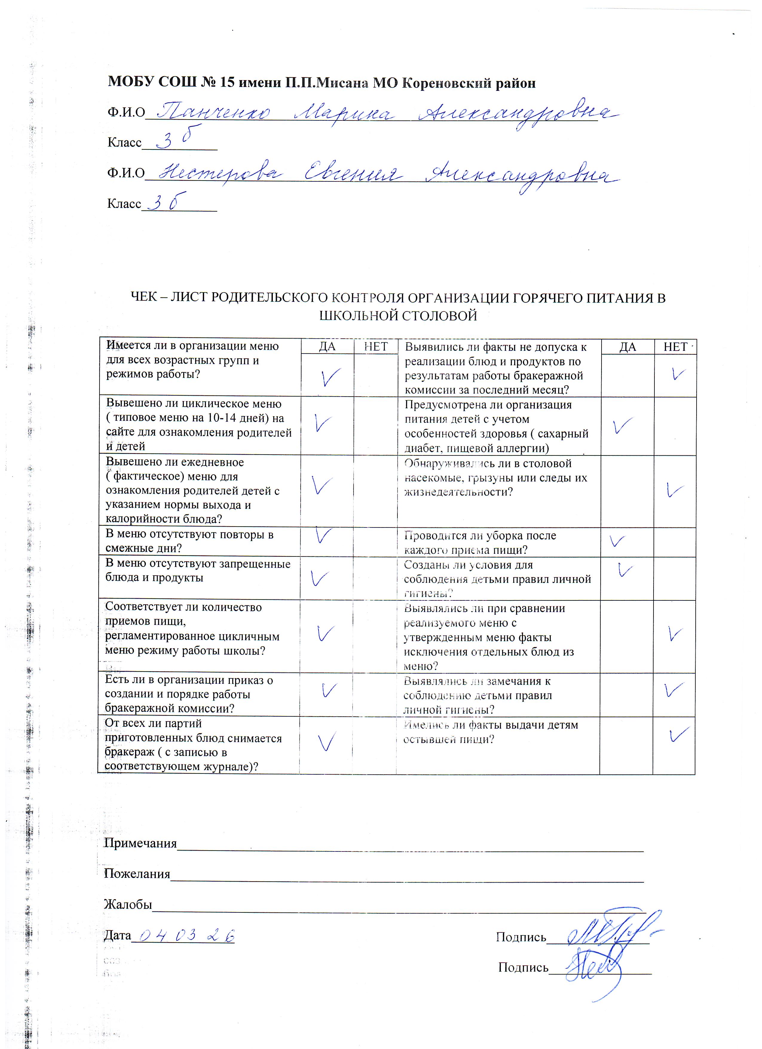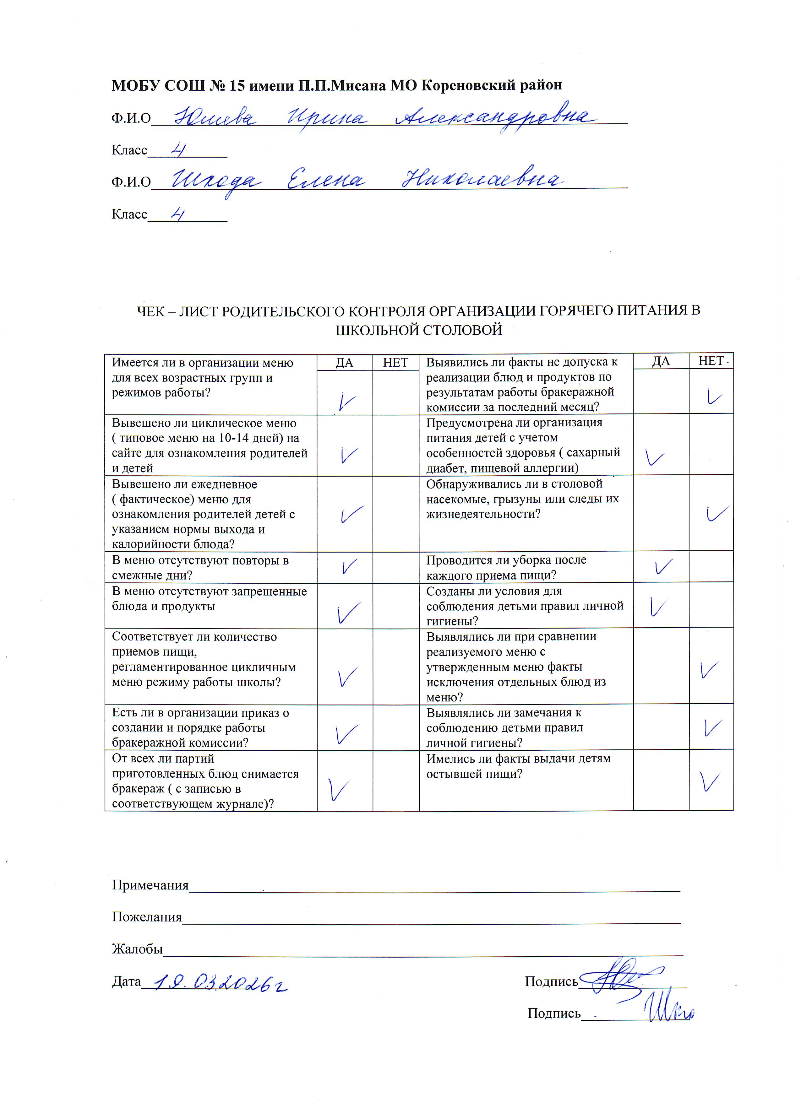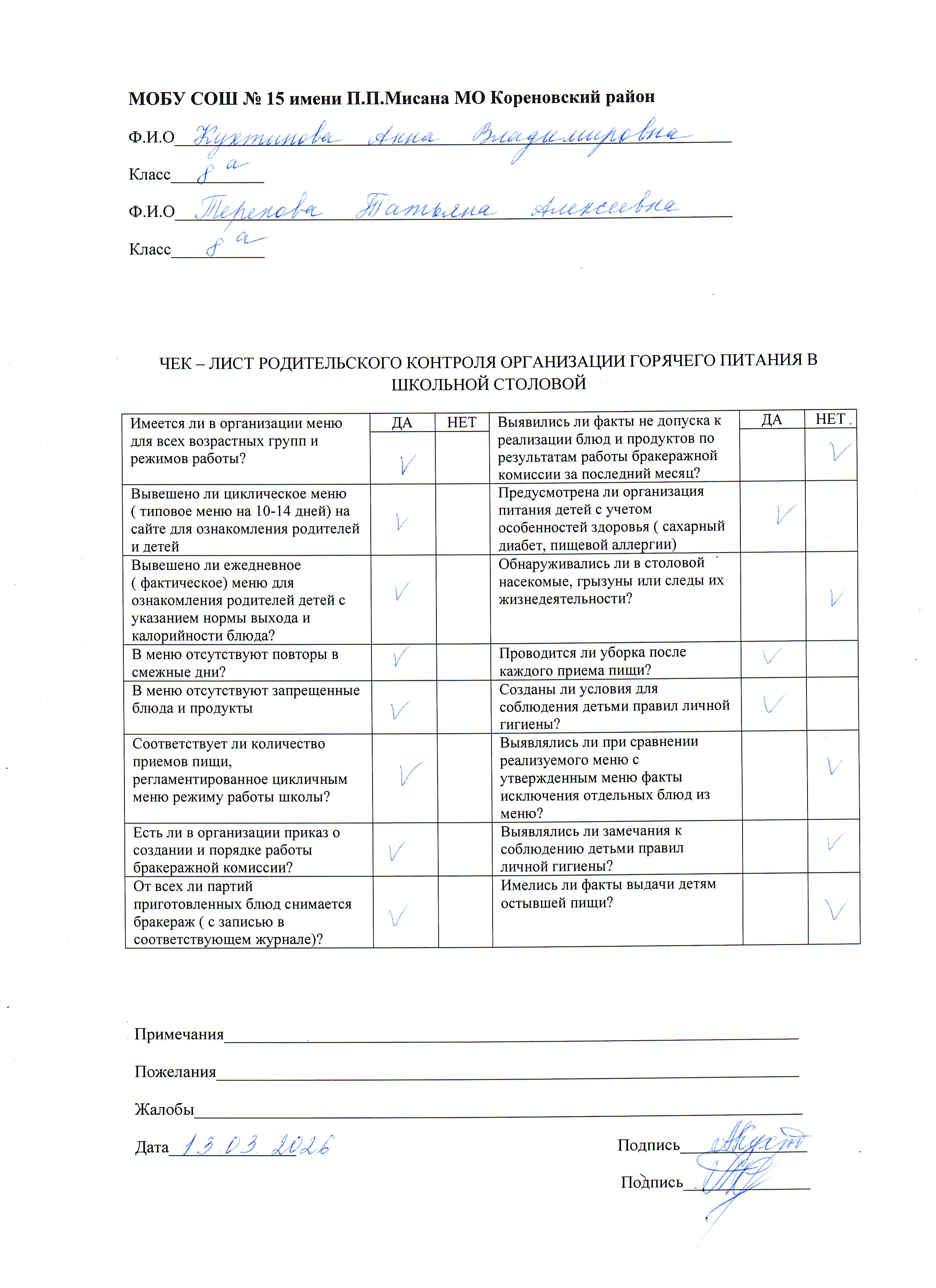 Протокол родительского контроля организации горячего питания в школьной столовой 10.03.2026-13.03.2026