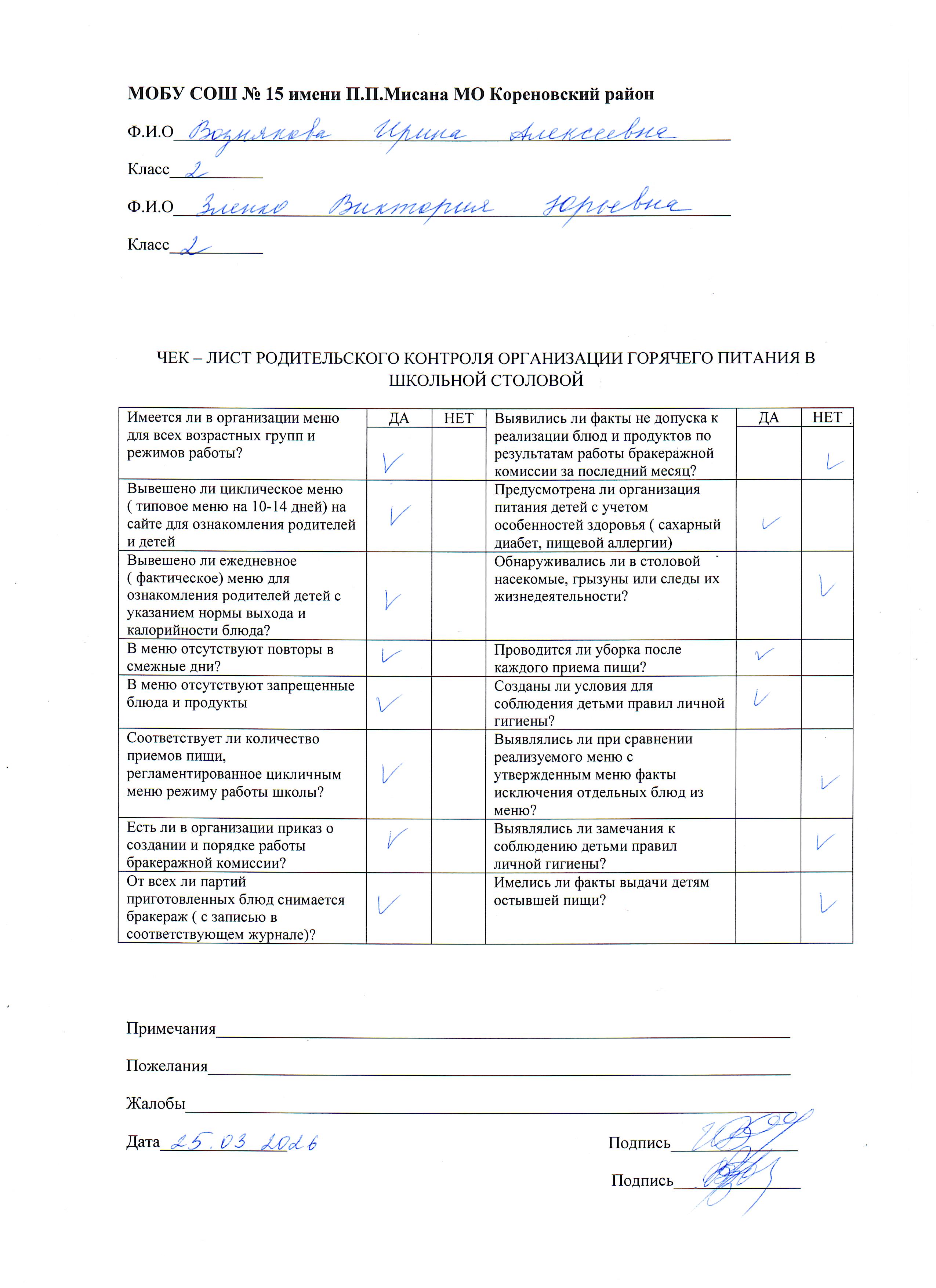 Протокол родительского контроля организации горячего питания в школьной столовой 23.03.2026-27.03.2026