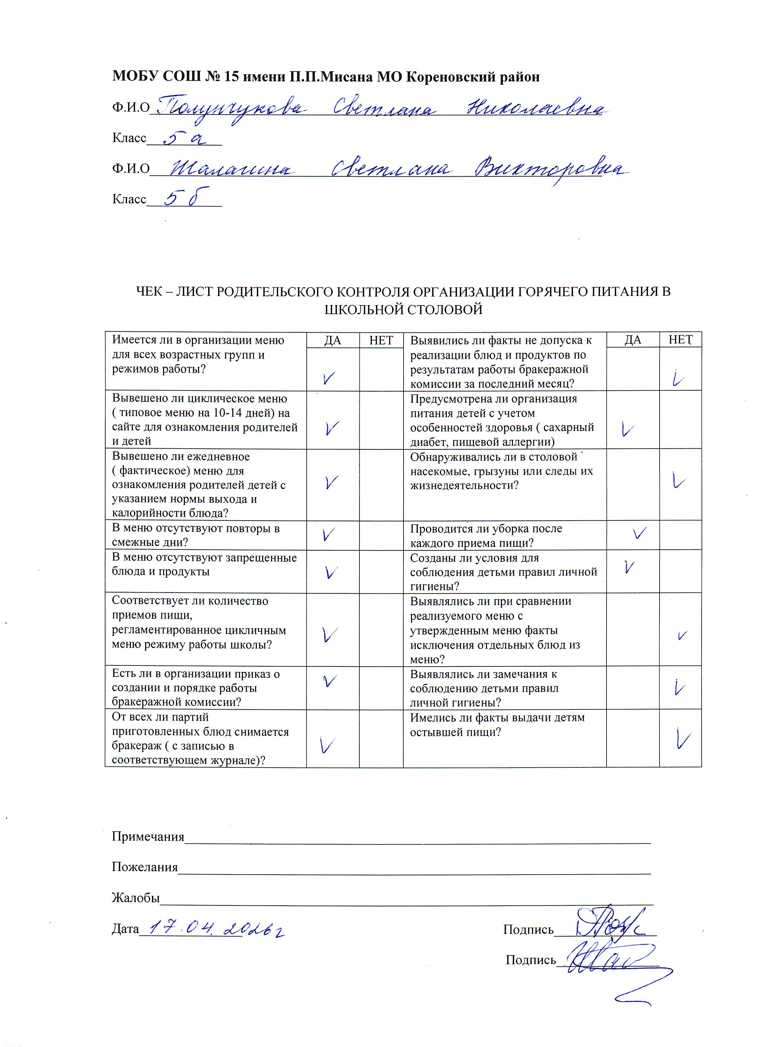 Протокол родительского контроля организации горячего питания в школьной столовой 13.04.2026-17.04.2026