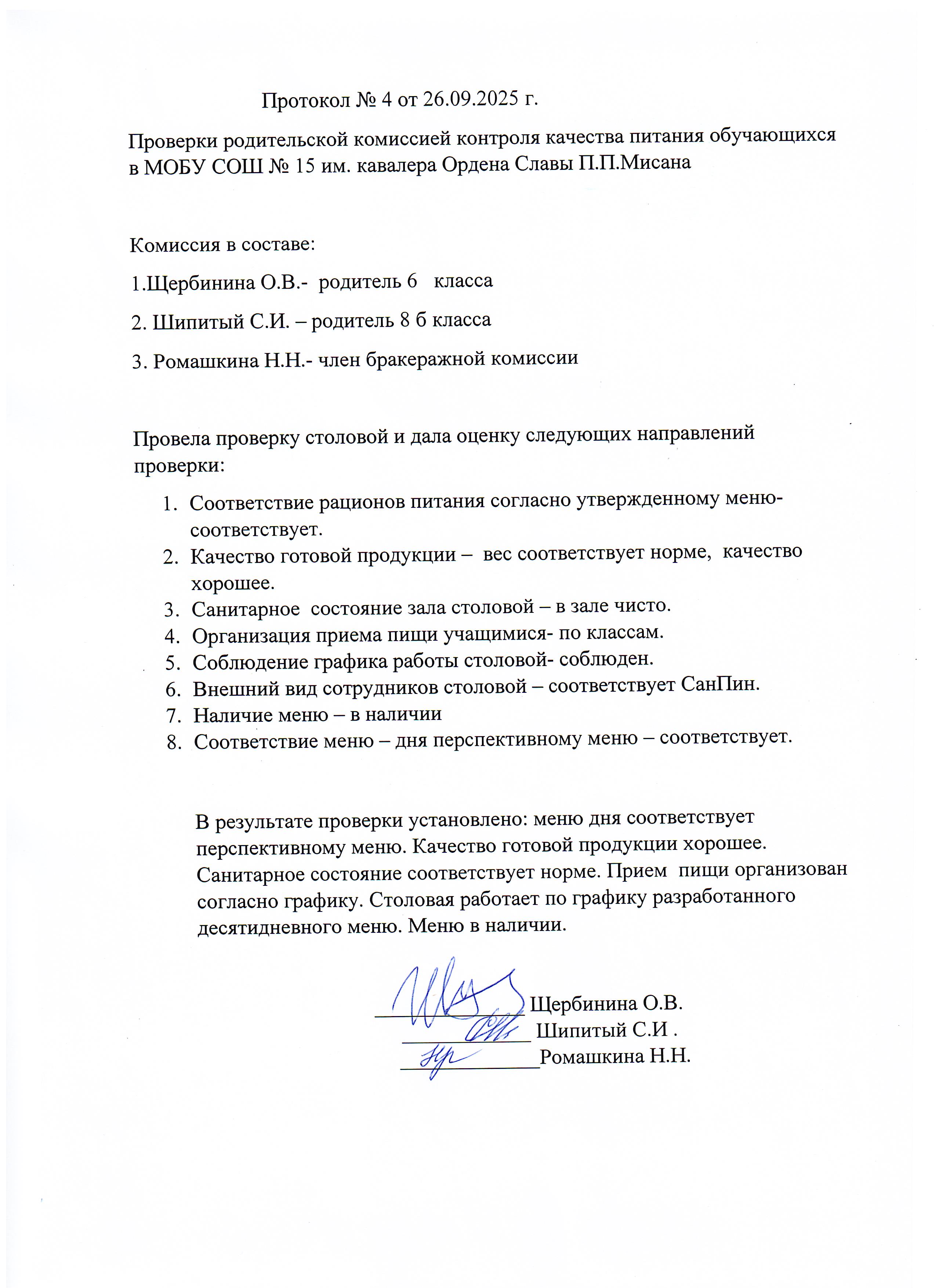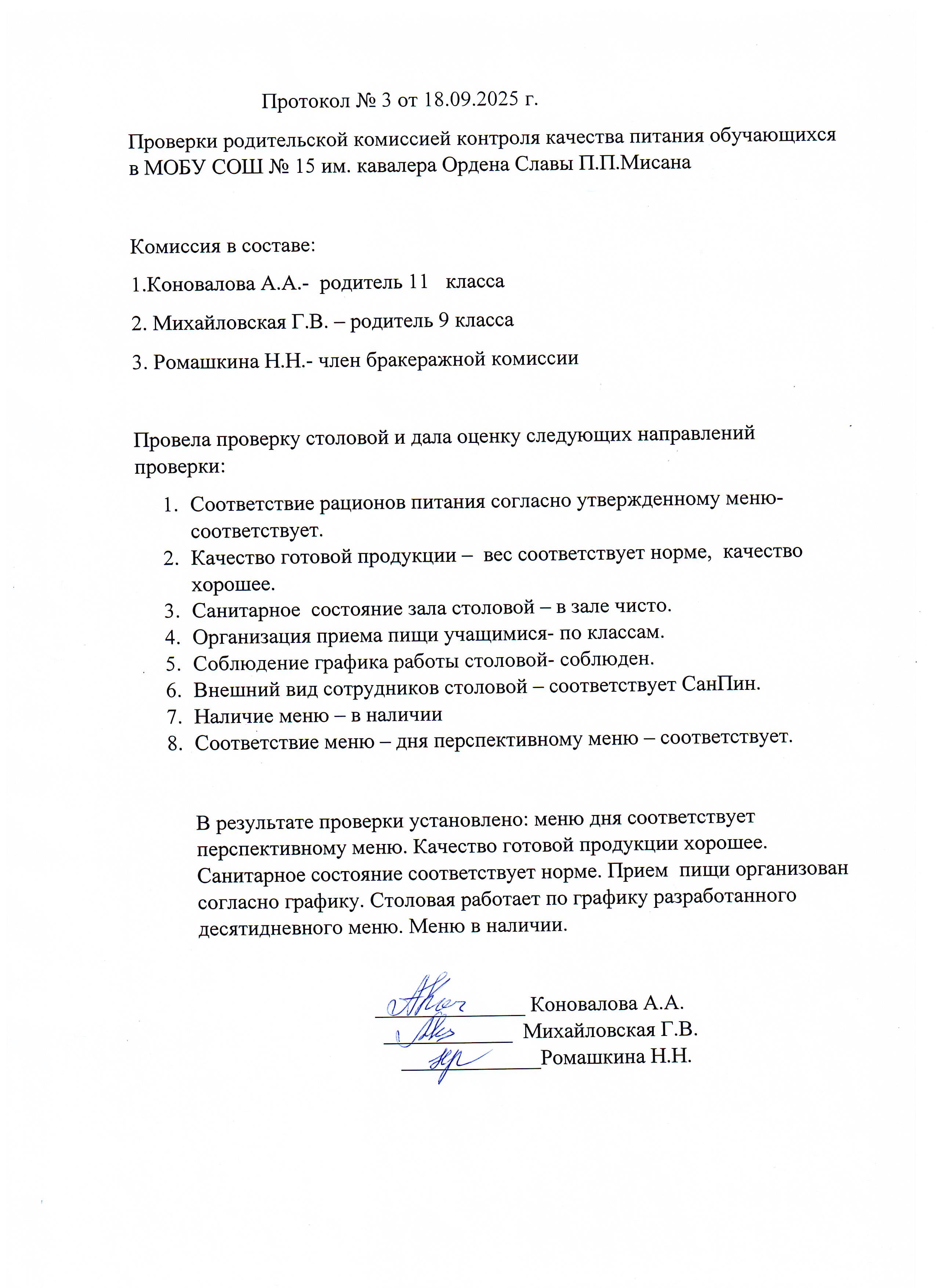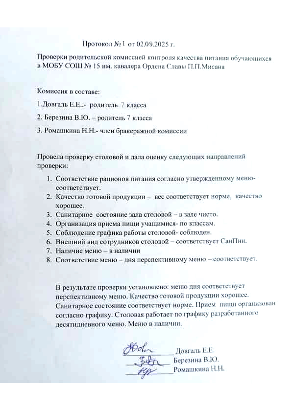 Протокол родительского контроля организации горячего питания в школьной столовой 15.09.2025-19.09.2025