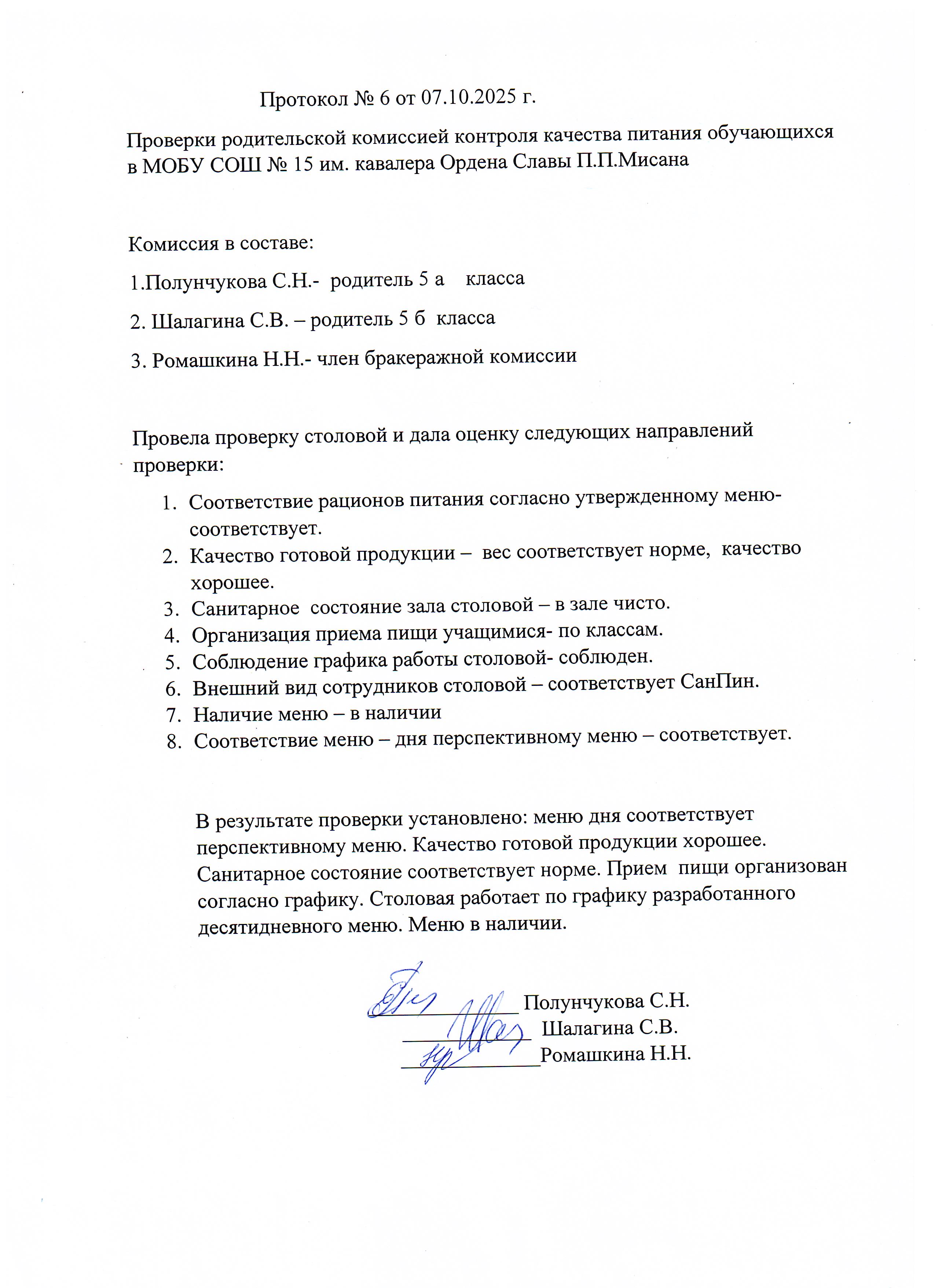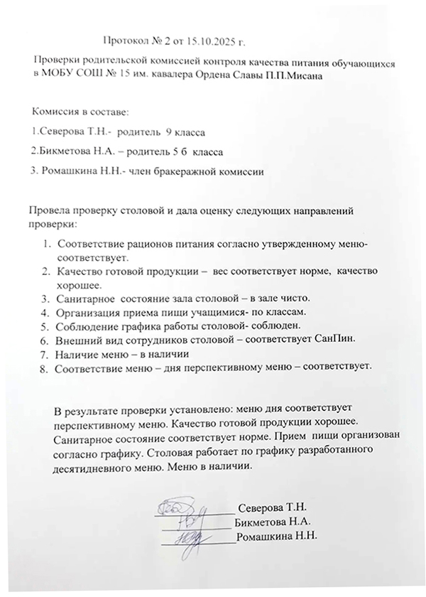 Протокол родительского контроля организации горячего питания в школьной столовой 06.10.2025-10.10.2025