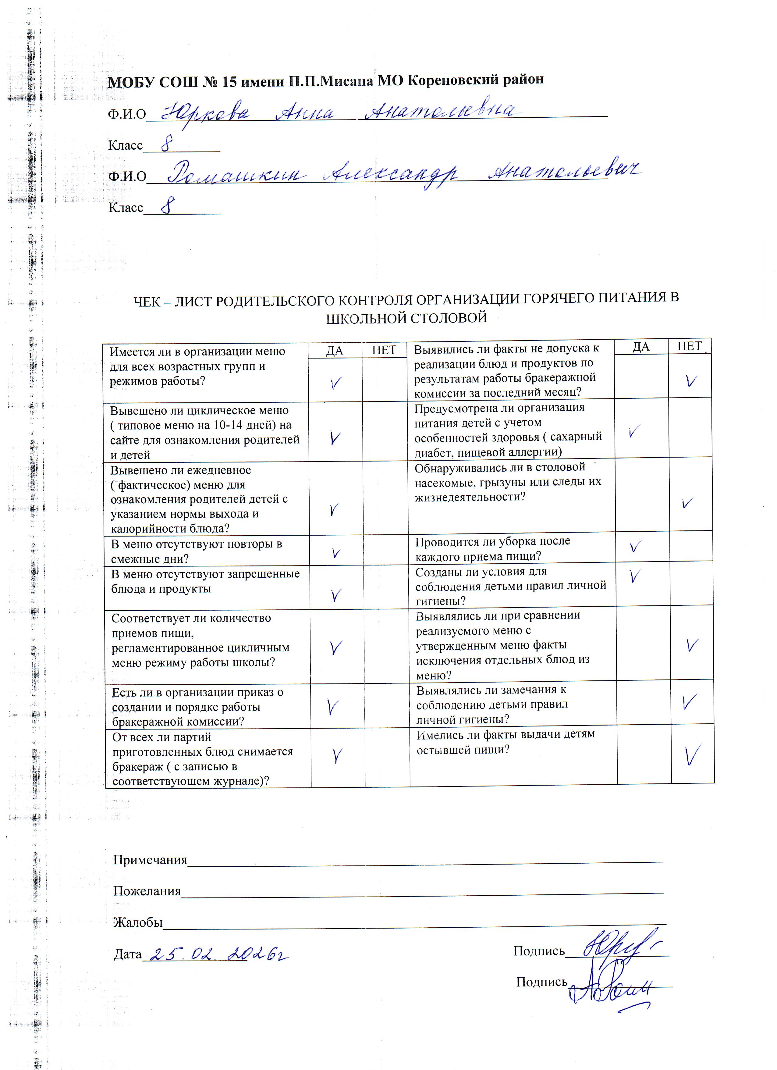 Протокол родительского контроля организации горячего питания в школьной столовой 24.02.2026-27.02.2026