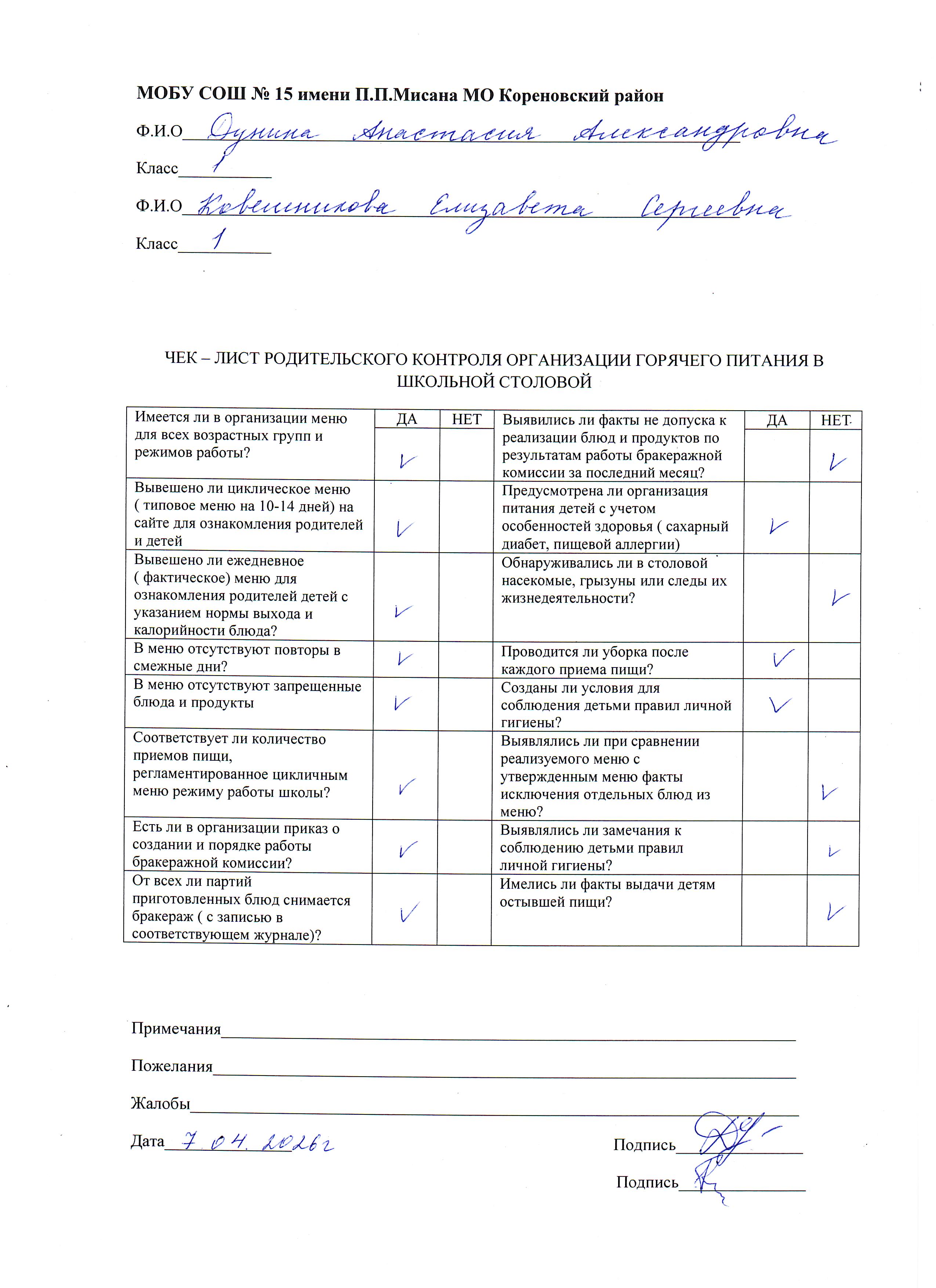 Протокол родительского контроля организации горячего питания в школьной столовой 05.11.2025-07.11.2025