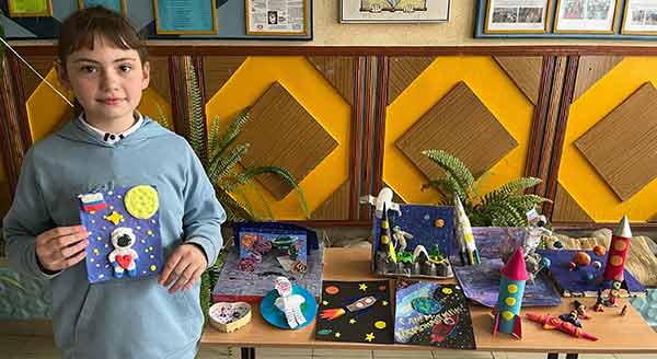 12 апреля в нашей школе оформлена выставка поделок и рисунков «Космос» в честь дня космонавтики.